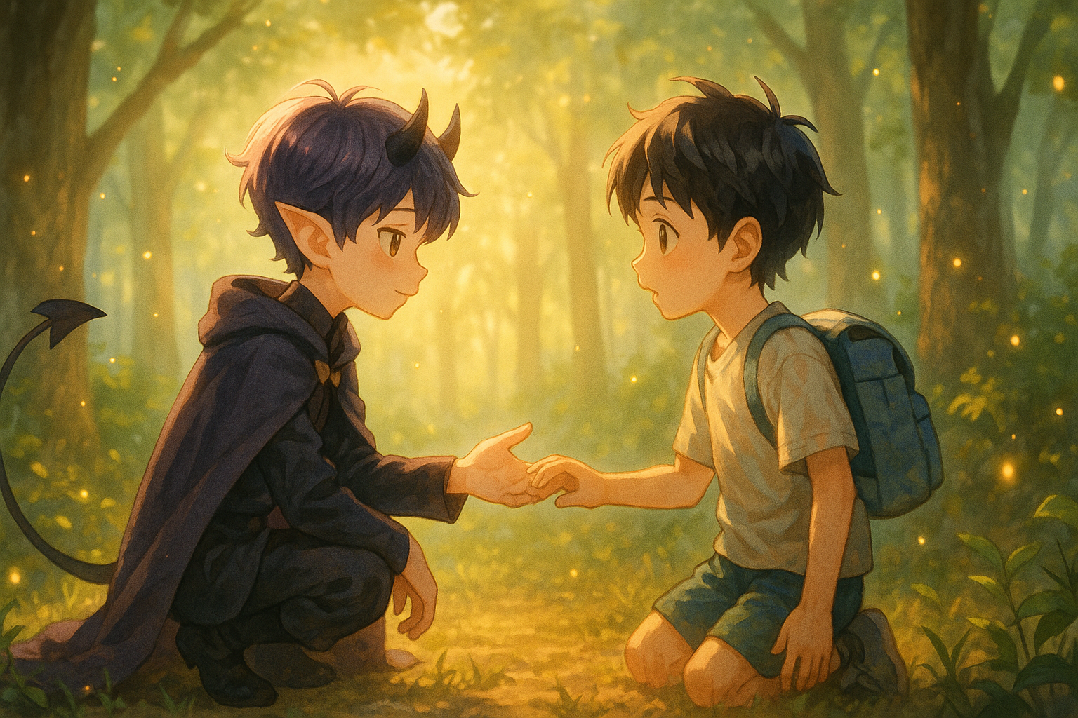 タソガレがまだ修行中の頃、彼は人間界を訪れ、そこで一人の少年――当時“ゆうちゃん”と名乗っていたアカツキと出会いました。当時は性別の判断がつきにくかったこともあり、タソガレはゆうちゃんを少女だと誤解。短い交流の中で感じた“ときめき”を、純粋な初恋として胸に刻みました。しかし年月が経ち、魔王として成長したタソガレが再び勇者アカツキと対峙した時、彼があの“ゆうちゃん”本人であることに気づき、すべての記憶がつながっていきます。